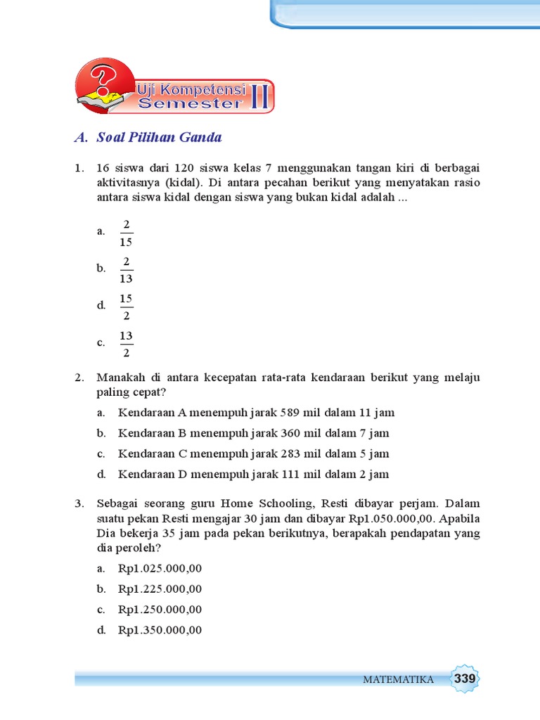Uji Kompetensi Semester 2 Matematika Kelas 7 Guru Galeri from id-static.z-dn.net 16 siswa dari 120 siswa kelas 7 menggunakan tangan kiri di berbagai aktivitasnya (kidal). Jaringan tema yang memberi gambaran kepada guru tentang suatu tema yang melingkupi beberapa kompetensi dasar (kd) dan indikator dari berbagai mata pelajaran. 16 siswa dari 120 siswa kelas 7 menggunakan tangan kiri di berbagai aktivitasnya (kidal). Di antara pecahan berikut yang menyatakan rasio antara siswa kidal dengan siswa yang bukan kidal adalah. Bab 1 persamaan dan pertidaksamaan nilai mutlak linear satu variabel uji kompetensi 1 1 hal 37 38 nomor 1 10 essai. Pada kesempatan ini saya akan berbagi soal soal yang mungkin bisa dijadikan referensi untuk penilaian akhir tahun khususnya pelajaran matematika smp kelas 7 semester genap kurikulum 2013 yang dilengkapi dengan kisi kisi dan jawabannya. 16 siswa dari 120 siswa kelas 7 menggunakan tangan kiri di berbagai aktivitasnya (kidal). Di antara pecahan berikut yang menyatakan rasio antara siswa kidal dengan siswa yang bukan kidal adalah.